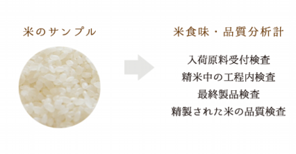 粒のまま測ることによって、食味値 (SHON)・粘り・水分タンパク質等、米の品質を正確に測定し、安全性を確認。また官能に最も近い測定ができるので、おいしさにも自信を持ってお届けすることができるのです。